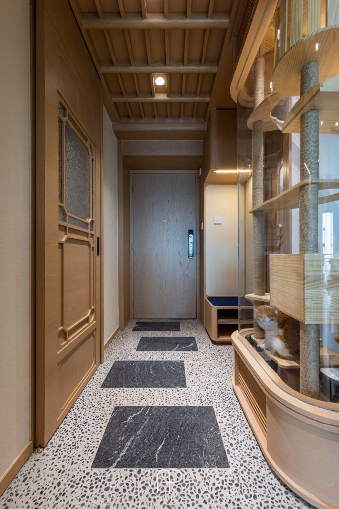 設計首先從玄關處的仿原木橫樑、碎石地面定調整體氛圍。特別規劃的玻璃隔間不只讓視覺更為通透,也能方便屋主能隨時與毛孩互動;巧妙的圓弧邊角也帶出和諧、趣味效果。
